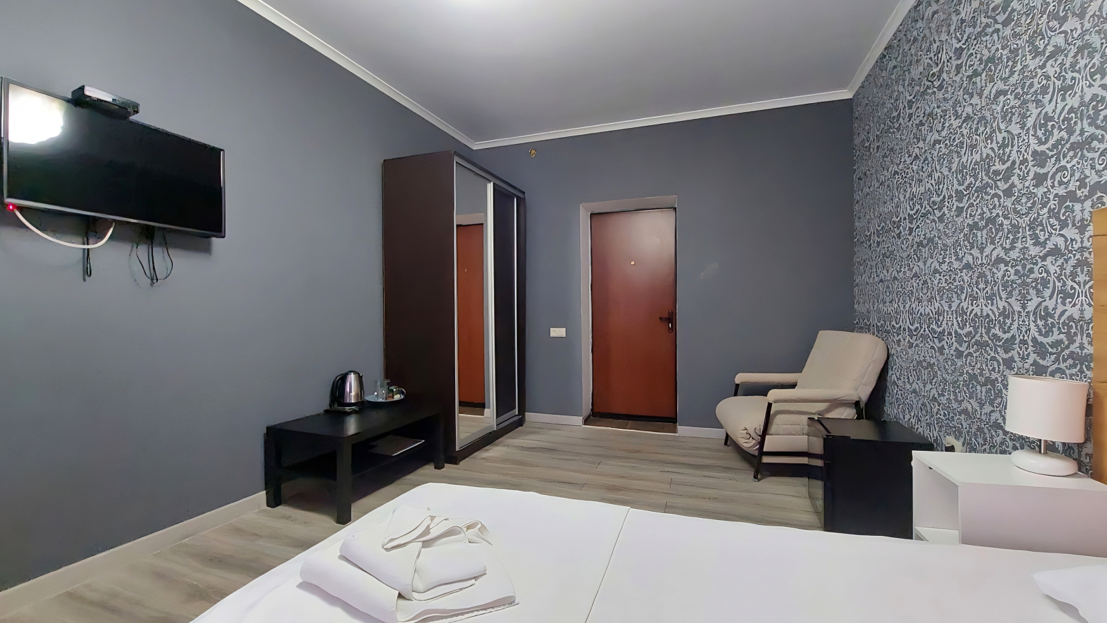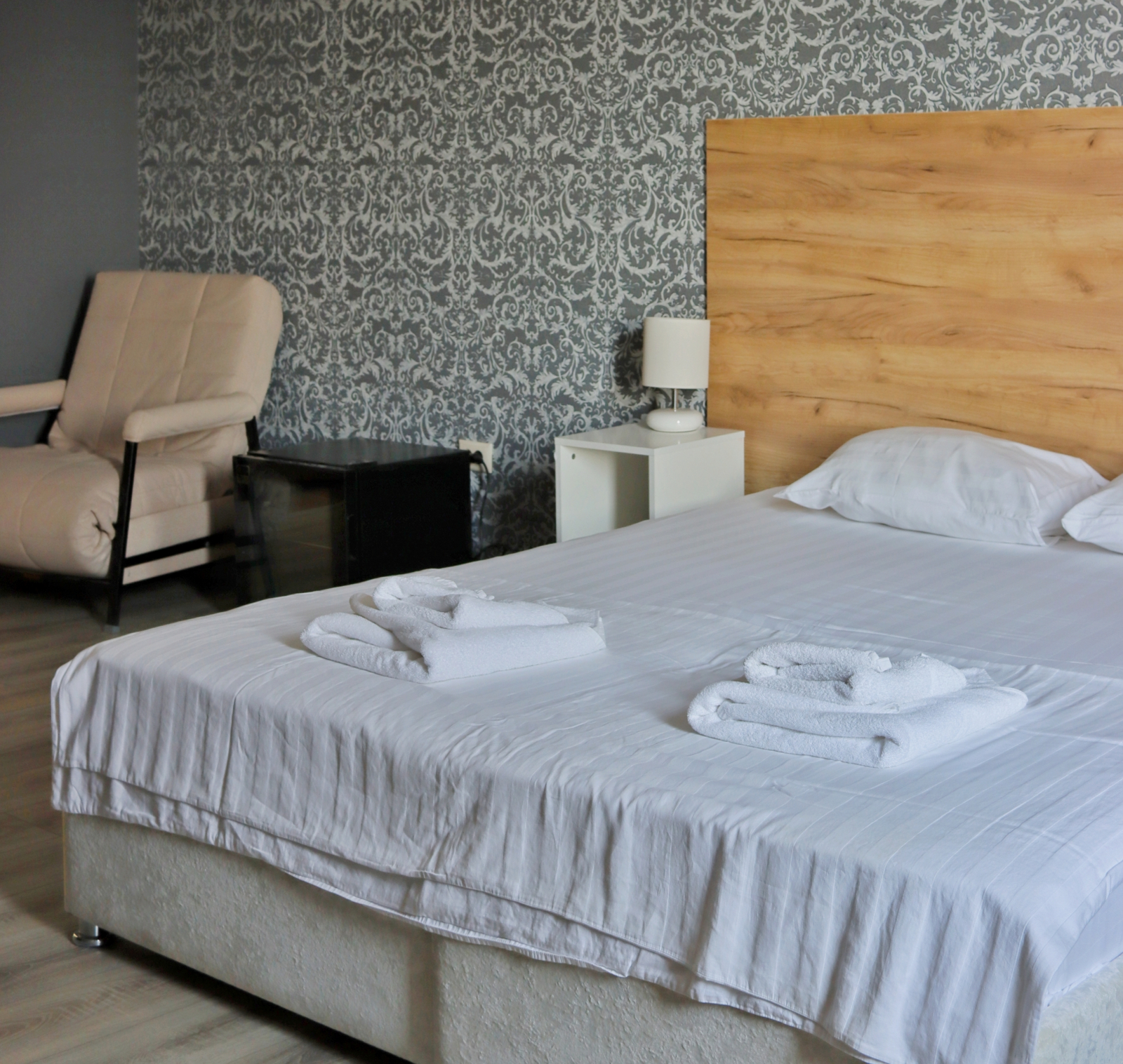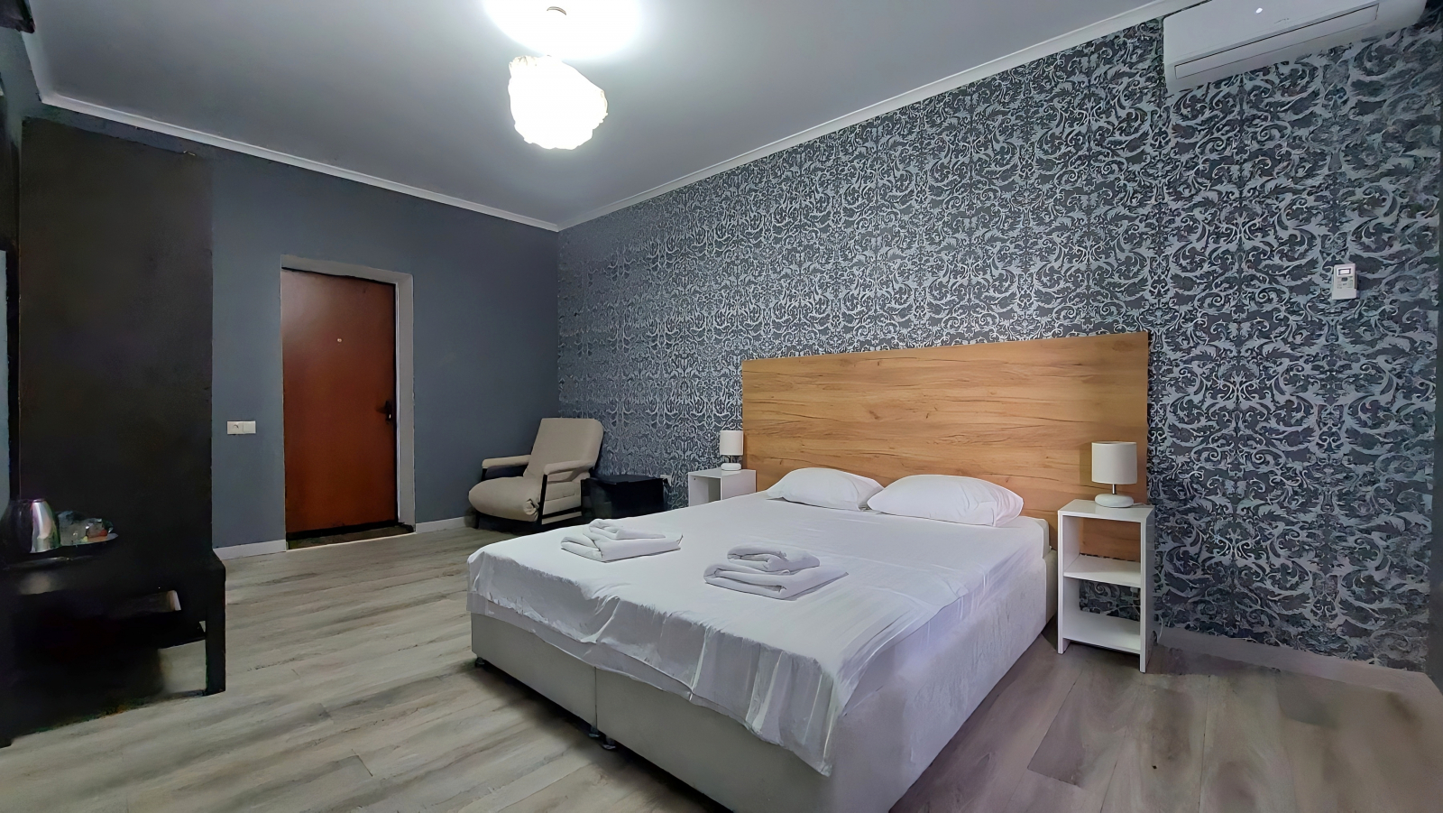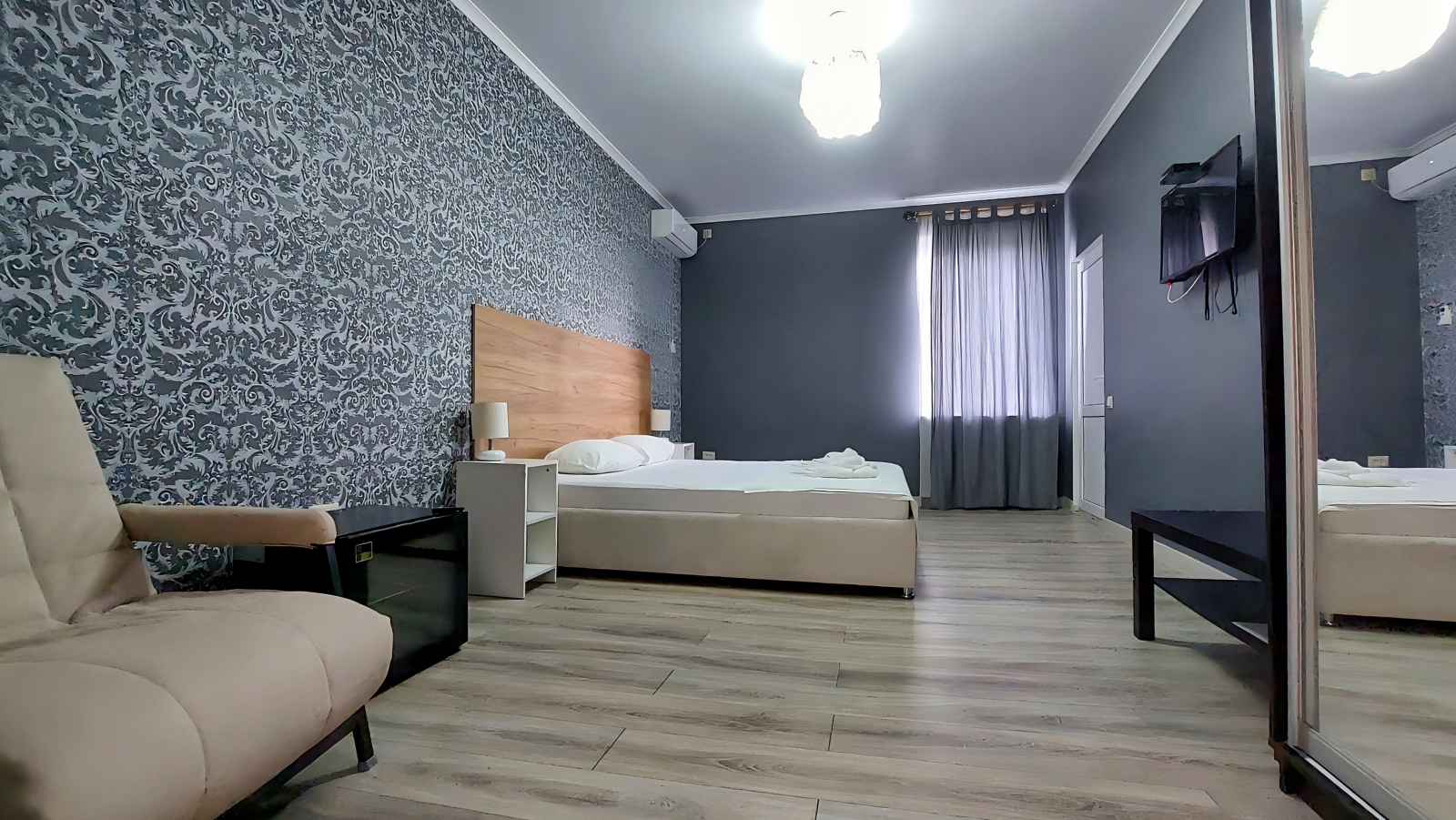 Площадь номера - 18 кв.м. 2 осн. места. 1 доп. место. Мебель: вешалка, диван (или кресло), зеркало, кровати односпальные /одна двуспальная кровать, прикроватные тумбочки, стол, стулья, шкаф. Оборудование: кондиционер, телевизор, холодильник, чайный набор посуды, электрочайник. Санузел: с душем, тапочки, туалетные принадлежности, фен, халат. Сервис: Wi-Fi бесплатно, смена полотенец, смена постельного белья, уборка номера. Терраса.